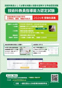 2026年(令和8年) 技術科教員指導能力認定試験要項について,以下から閲覧できます。